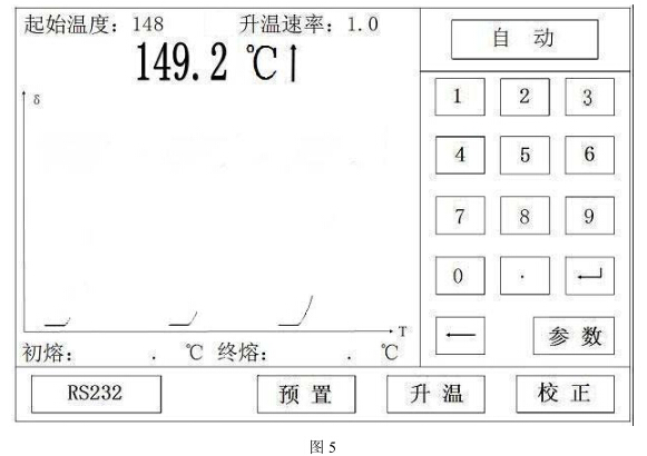 5)按升溫鍵,操作提示顯示“↑”,此時儀器將按照預(yù)先設(shè)定的工作參數(shù)對樣品進(jìn)行測量。(見圖 5)