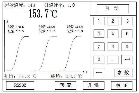 本儀器采用光電方式自動檢測熔化曲線的變化。當(dāng)溫度達(dá)到初熔點(diǎn)和終熔點(diǎn)時,顯示初熔溫度及終熔溫度,并保存至檢測下一樣品。