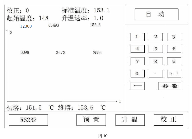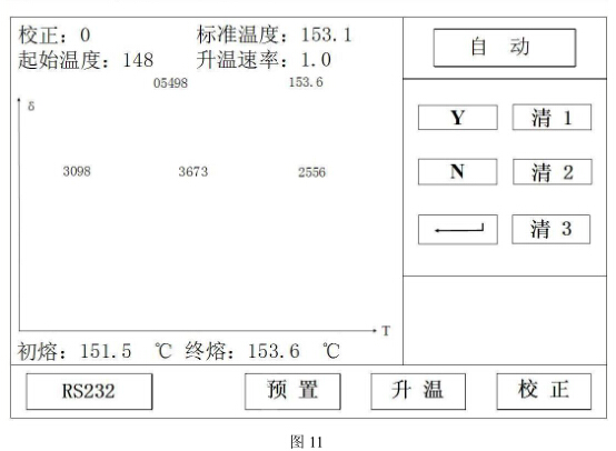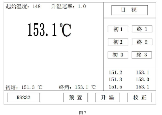 當(dāng)?shù)竭_(dá)初熔點(diǎn)時,按初熔鍵,當(dāng)?shù)竭_(dá)終熔點(diǎn)時,按終熔鍵,同時,顯示初熔、終熔數(shù)據(jù)。(見圖 7)