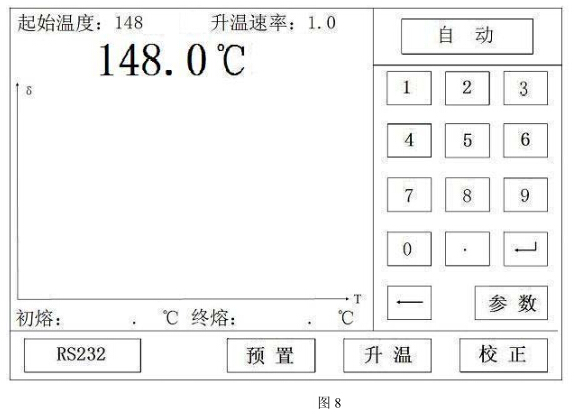 8) 若用戶想測量另一新樣品,輸入完“起始溫度”并按“預(yù)置”鍵后,原先的曲線將自動清除,開始下一樣品的測量。若是自動模式見圖 8