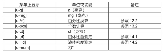 2. 按數(shù)次【CAL】鍵,顯示[Unit SEL],按【O/T】鍵。顯示[U-g]。此后,每按 1 次【CAL】鍵,按[U-mg](表示 mg 單位)、[u-%](表示%換算)、[U-PCS](表示個數(shù)計算功能)、[U-ct](表示 ct克拉單位)、[u-,d] (表示固體比重測定)、[U-d](表示液體比重測定)、[U-mon](表示匁單位)的順序切換顯示。另外,在現(xiàn)在登錄的單位或功能時穩(wěn)定標志(?)同時顯示。