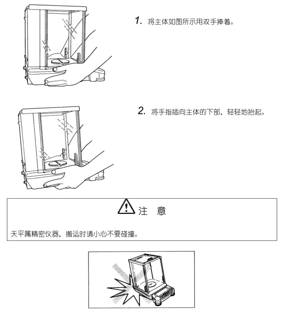 用手搬運時…………取下稱量室內(nèi)的防對流圈、稱量盤、盤托后,如圖所示抬起,用雙手牢牢抓住搬運。