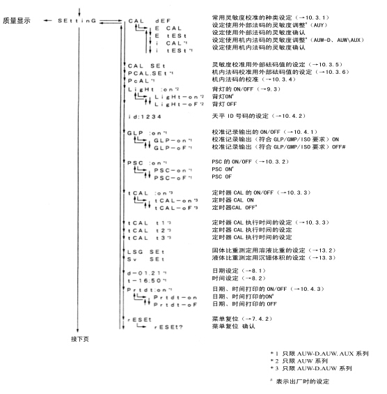 AUW-D/AUW/AUX/AUY 系列可以顯示 g 以外單位的質(zhì)量。預先登錄的單位,在質(zhì)量顯示時只須按【UNIT】鍵,即可切換顯示。出廠時,登錄的是 g、%、PCS、ct。使用 AUW-D/AUW/AUX/AUY 系列具備的其他單位時,按照 12.1 進行預先登錄。不使用的單位也可以解除。但是 g 不能解除。個數(shù)計算、比重測定的功能也按 12.1 單位設定進行登錄和解除。登錄了的單位可在質(zhì)量顯示中使用【UNIT】鍵調(diào)出。關于個數(shù)計算請參閱 13.1,關于固體比重測定,液體比重測定分別參閱 13.2 和 13.3。