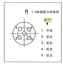 2. 約為稱量能力的 1/4 的砝碼按左圖所示的順序號在稱量盤上挪動,記錄各值X1~X5。稱量盤中