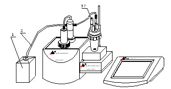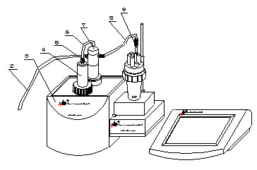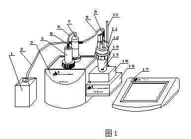 a) 將容量滴定單元(3)與和控制單元放在試驗(yàn)臺(tái)上,按圖示將攪拌器(15)放在永停測(cè)量單元(16)上, 插入電極梗(10);裝入溶液杯支架(12)和溶液杯(13),在溶液杯(13)中放入攪拌珠(14),并用緊定螺釘(11)分別瑣緊攪拌器(15)和溶液杯(13)。