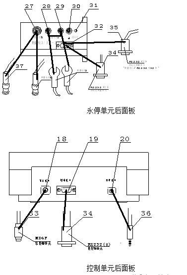 c) 用控制單元―――>永停測(cè)量單元專用連接線(34)將控制單元“測(cè)量接口”(19)和永停測(cè)量單元“測(cè)量接口/RS232”(32)連接起來(lái)。