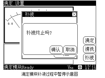 滴定開始后,儀器會(huì)自動(dòng)打開攪拌器,以用戶設(shè)定的攪拌速度攪拌10s,同時(shí)滴定模塊會(huì)開始補(bǔ)液,等儀器補(bǔ)液結(jié)束,儀器才開始真正的滴定。儀器會(huì)按照自動(dòng)滴定模式控制整個(gè)滴定過(guò)程,用戶不必進(jìn)行過(guò)多的干預(yù),儀器會(huì)自動(dòng)添加、自動(dòng)判斷、自動(dòng)采樣、自動(dòng)評(píng)估終點(diǎn),一面添加,一面動(dòng)態(tài)顯示測(cè)量值和滴定數(shù)據(jù),如果儀器發(fā)現(xiàn)終點(diǎn),儀器會(huì)鳴叫3次提示用戶,滴定自動(dòng)終止。在滴定過(guò)程中,用戶隨時(shí)可按“終止”鍵來(lái)終止滴定。儀器將詢問用戶是否真的終止滴定,顯示“終止滴定嗎?”等字樣,用戶可按實(shí)際需要終止或繼續(xù)滴定下去。如果儀器發(fā)現(xiàn)已添加完用戶所設(shè)定的結(jié)束體積(最大體積),則儀器將自動(dòng)提示用戶,是否繼續(xù),同樣用戶可按實(shí)際需要選擇終止滴定或繼續(xù)滴定。按“確認(rèn)”鍵結(jié)束滴定,按“取消”鍵,繼續(xù)滴定;顯示如下: