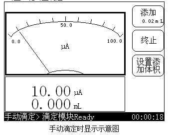 手動(dòng)滴定模式為用戶自己手動(dòng)添加滴定劑、手動(dòng)滴定的滴定模式。該滴定模式可幫助用戶尋找滴定終點(diǎn)。在儀器的起始狀態(tài)下,按“滴定”鍵,選擇“手動(dòng)滴定”即可進(jìn)入手動(dòng)滴定模式,顯示如下。