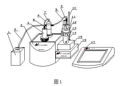 如圖:儀器由控制單元(17)、容量滴定單元(3)、電導測量單元(16)三部分組成。其中,可由PC機(需安裝本廠ZDJ-5型自動滴定儀控制軟件)代替控制單元進行滴定控制。