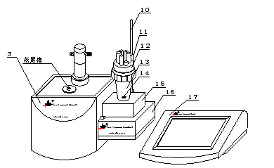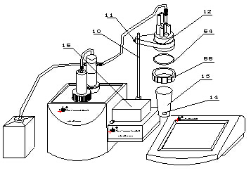 a 將容量滴定單元(3)與和控制單元放在試驗臺上,按圖示將攪拌器(15)放在電導測量單元(16)上, 插入電極梗(10);裝入溶液杯支架(12)和溶液杯(13),在溶液杯(13)中放入攪拌珠(14),并用緊定螺釘(11)分別瑣緊攪拌器(15)和溶液杯(13)。