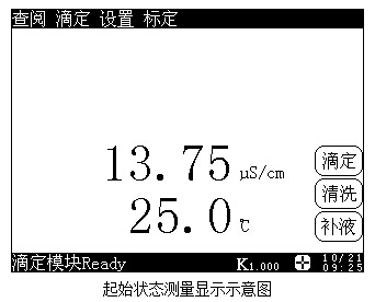 其中顯示屏上面為菜單項,包括 “查閱”(測量結束后并有3個以上有效數(shù)據(jù))、“滴定”、“設置”、“標定”等;中間顯示當前的電導值以及當前的溫度值;右面為常用的按鍵,包括“滴定”、“清洗”、“補液”;下面顯示滴定模塊狀態(tài)、攪拌器圖標、電極常數(shù)K值和系統(tǒng)時間。用戶按菜單項、常用鍵或者圖標等可以進入相應的功能模塊。