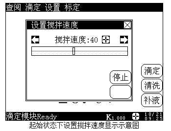 其中,設置窗口上“啟動”(或“停止”)按鍵用來啟動(或者關閉)攪拌器,滑動條以及顯示的攪拌速度對應當前攪拌器的實際速度值,用戶直接按滑動條或者按“<”、“>”鍵即可設置攪拌器的速度,設置完畢,按右上角的“關閉”鍵,返回儀器起始狀態(tài)。