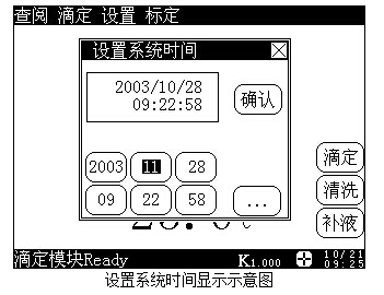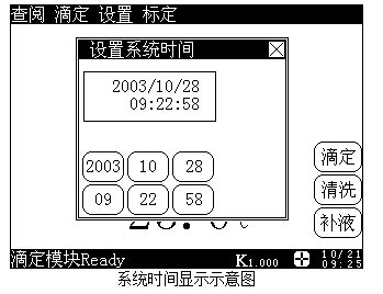 在儀器的起始狀態(tài)下,按菜單項“設置”鍵,選擇“系統(tǒng)時間”,按“確認”鍵即可設置儀器的日期、時間參數(shù)。顯示如下: