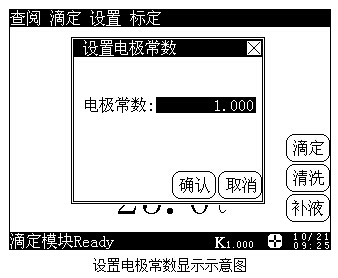 例如:當前使用的電導電極的常數(shù)為0.98,則具體操作步驟如下:在儀器的起始狀態(tài)下,按菜單項“設置”鍵,選擇“電極常數(shù)”,按“確認”鍵即可設置電導電極常數(shù)。顯示如下: