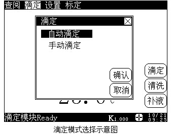 儀器共提供2種滴定模式,即自動滴定和手動滴定等。在儀器的起始狀態(tài)下,按“滴定”鍵,或者按菜單項上的“滴定”項,儀器會顯示全部滴定模式,顯示如下,用戶可以選擇所需的滴定模式進行相應的滴定。