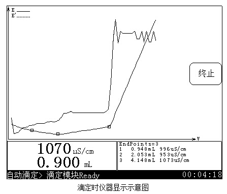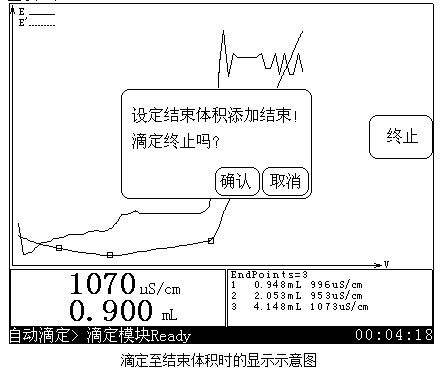 如果儀器發(fā)現(xiàn)終點,首先會鳴叫一聲,同時顯示屏上提示“終點產生!”字樣,此時用戶可以選擇終止滴定或者繼續(xù)滴定下去。當新的拐點出現(xiàn)時,儀器會鳴叫3次提示用戶,并計算出真正的終點值。