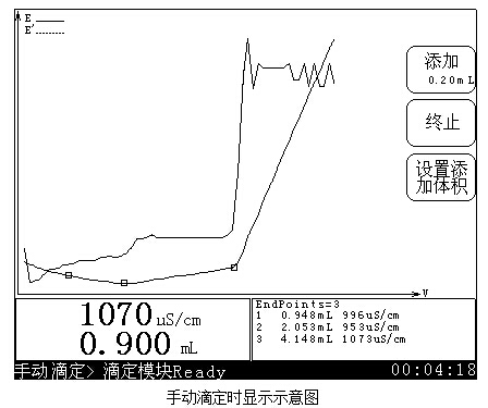 如果本次滴定只有一個終點,在儀器提示“終點產生”后,用戶可以繼續(xù)添加幾次,然后自己終止滴定,此時儀器才會計算出最后的終點值。