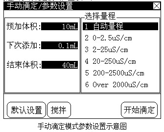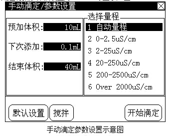 為了保證測量的準確性,當用戶知道當前滴定的電導率范圍時,建議用戶使用手動量程,選擇對應的量程進行滴定;否則用戶可以使用自動量程檔進行滴定。