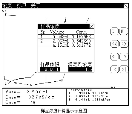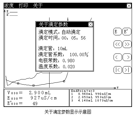 其中上面為菜單項,包括“濃度”(如果有終點的話)、“打印”、“關于”和“關閉”鍵;中間為滴定曲線區(qū),用戶可以查閱滴定數(shù)據(jù);左下角為指示線對應的滴定數(shù)據(jù),包括電導值、體積、微分等;右下角為終點區(qū),顯示終點數(shù)和對應終點值。