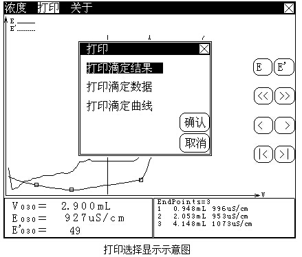 滴定結束后,如果用戶需要打印滴定結果、滴定數(shù)據(jù)、滴定曲線,則可按菜單項“打印”鍵,顯示如下,選擇需要打印的內容,打開打印機電源,儀器即可打印相應內容。