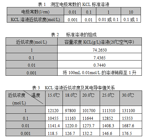 根據(jù)電極常數(shù),選擇合適的標準溶液(見表1)、配制方法(見表2)、標準溶液與電導率值關系表(見表3);