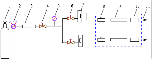 圖中:1—高壓氣瓶(載氣);2—減壓閥(氫氣表或氧氣表);3—凈化器;4—穩(wěn)壓閥;5—壓力表;6—針閥或穩(wěn)流閥;7—壓力表;8—汽化室;9—色譜柱;10—檢測器;11—恒溫箱。