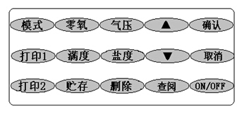 儀器共有15個操作鍵,分別為:ON/OFF、模式、零氧、滿度、氣壓、鹽度、打印1、打印2、貯存、刪除、查閱、、、確認(rèn)和取消。