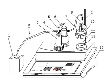 c 將滴定管(3)安裝在主機(jī)(13)上,注意,滴定管上的活塞桿應(yīng)插入頂桿上的燕尾槽內(nèi),然后拼緊滴定管(3)上的螺母;按圖插入滴液管(8);然后按圖所示分別將輸液管(2)(最長(zhǎng)的一根)、輸液管(5)(最短的一根)、輸液管(7)用接口螺母(4)聯(lián)接好,注意,接口螺母(4)一定要拼緊,不得有泄漏現(xiàn)象。