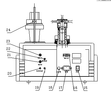 a 將主機(jī)(13)放在試驗(yàn)臺(tái)上,按圖示將電極梗(9)插入主機(jī)(13)內(nèi);溶液杯支架(10)和溶液杯(11),在溶液杯(11)中放入攪拌珠(12),并用緊定螺釘(24)鎖緊溶液杯(11)。