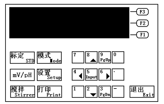 儀器共有22個(gè)鍵,分別為:數(shù)字(0~9)、負(fù)號(hào)、小數(shù)點(diǎn)、F1、F2、F3、mV/pH、標(biāo)定、模式、設(shè)置、攪拌、打印、和退出鍵。其中有些鍵為復(fù)用鍵。以下為這些鍵的使用介紹。