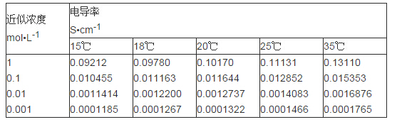 我國的電導(dǎo)率基準(zhǔn)是用相對(duì)法建立起來的,它建立于國際公認(rèn)值的基礎(chǔ)上,、以標(biāo)準(zhǔn)物質(zhì)為實(shí)物依據(jù)。1989年國家技術(shù)監(jiān)督局發(fā)布了四種氯化鉀溶液在五個(gè)溫度下的電導(dǎo)率值,見下表: