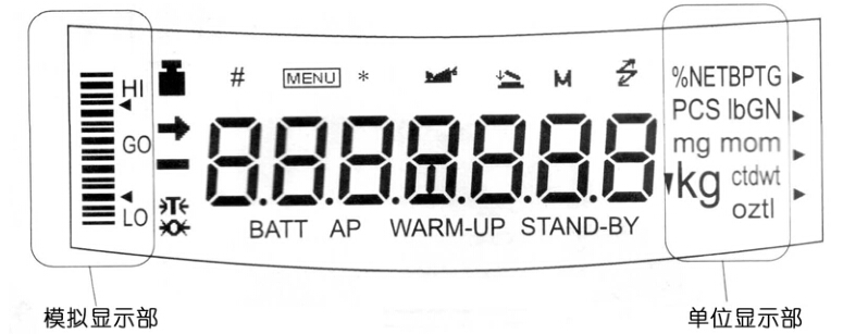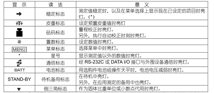 *穩(wěn)定標(biāo)志 負(fù)荷慢慢變化時,或設(shè)定的穩(wěn)定檢測范圍較大時,有時在穩(wěn)定標(biāo)志亮燈的狀態(tài)下顯示變化值,穩(wěn)定標(biāo)志