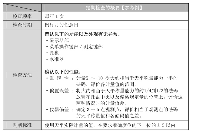 如果檢查內(nèi)容比較寬松,則在未能發(fā)現(xiàn)異常的狀況下使用天平的風(fēng)險(xiǎn)就比較高,如果過(guò)度嚴(yán)格,則有可能導(dǎo)致業(yè)務(wù)效率降低,因此,請(qǐng)根據(jù)風(fēng)險(xiǎn)、工作上所要求的性能等,充分討論檢查內(nèi)容,制定出合理的檢查內(nèi)容。