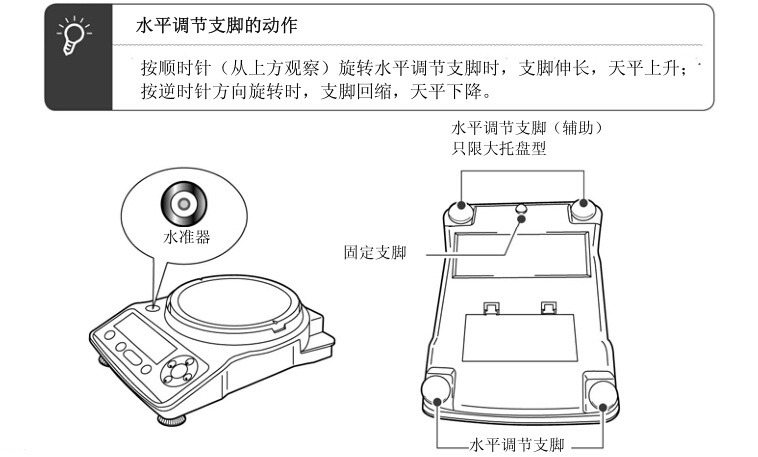 維持水平。大托盤型在后部左右也帶有水平調(diào)節(jié)支腳,起到在將重的樣品(稱量物)