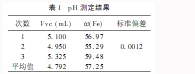 計(jì)算批pH最小時(shí)Vc的體積,Vc的數(shù)值可在電腦存儲(chǔ)的數(shù)據(jù)中直接讀出,然后按照ω(Fe)=2Vvc-Cvc×10-3×MFe/m樣×100計(jì)算鐵含量。按此法計(jì)算其他兩次的數(shù)值。將結(jié)果填入表一中,計(jì)算標(biāo)準(zhǔn)偏差和平均值。