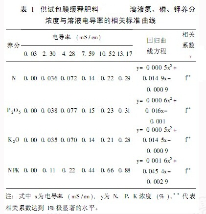 表1分別列出了供試包膜緩釋肥料溶解于水中后, 溶液氮、磷、鉀三養(yǎng)分濃度,單一氮、磷、鉀養(yǎng)分濃度和總養(yǎng)分濃度分別與溶液電導(dǎo)率間的相關(guān)曲線方程。由表1可知,緩釋肥料溶液氮、磷、鉀單一養(yǎng)分,氮、磷、鉀三種養(yǎng)分的濃度和總養(yǎng)分濃度與溶液的電導(dǎo)率間呈極顯著的正相關(guān),相關(guān)關(guān)系可用二次曲線擬合,相關(guān)系數(shù)r均為1。結(jié)果表明,利用緩釋肥料標(biāo)準(zhǔn)曲線方程可以準(zhǔn)確地計(jì)算緩釋肥料溶液某一電導(dǎo)率值下溶液的氮、磷、鉀濃度,并換算相應(yīng)的養(yǎng)分釋放率。