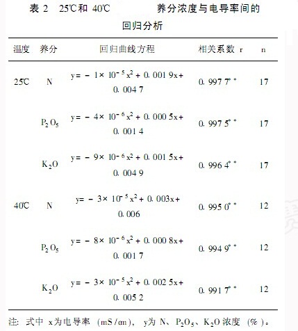 將25℃和40℃下測(cè)得的電導(dǎo)率與對(duì)應(yīng)的氮、磷、鉀實(shí)測(cè)濃度測(cè)定值進(jìn)行回歸分析,其回歸方程結(jié)果列于表2。由表2結(jié)果可以看出,電導(dǎo)率與實(shí)測(cè)的氮、磷、鉀之間的相關(guān)系數(shù)均達(dá)到了極顯著的水平。但是3個(gè)養(yǎng)分中氮的相關(guān)系數(shù)最大,其次是鉀,而磷的最小。也就是說(shuō),如果用溶出液的電導(dǎo)率,特別是用電導(dǎo)率標(biāo)準(zhǔn)曲線法預(yù)測(cè)緩釋肥料氮、磷、鉀養(yǎng)分釋放率,通過(guò)緩釋肥料溶液氮、磷、鉀養(yǎng)分濃度與溶液電導(dǎo)率的相關(guān)標(biāo)準(zhǔn)曲線方程,只計(jì)算氮素的釋放率即可,而且比較準(zhǔn)確。