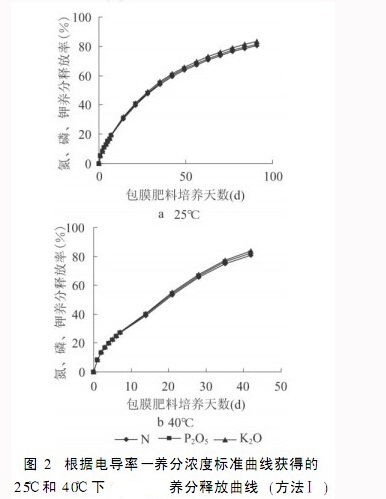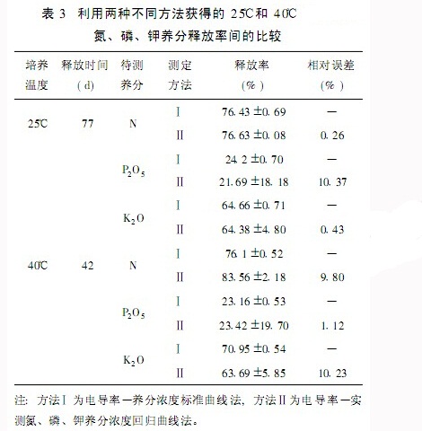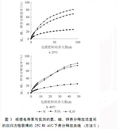 圖2是根據(jù)電導(dǎo)率——養(yǎng)分濃度標(biāo)準(zhǔn)曲線法獲得的25℃和40℃下的養(yǎng)分釋放曲線(方法Ⅰ)。圖3是根據(jù)電導(dǎo)率與實(shí)測(cè)的氮、磷、鉀養(yǎng)分釋放濃度間的回歸方程獲得的25℃和40℃下養(yǎng)分釋放曲線(方法Ⅱ)。對(duì)比圖2和圖3結(jié)果可見(jiàn),用標(biāo)準(zhǔn)曲線法,無(wú)論是25℃還是40℃下,自培養(yǎng)開(kāi)始至釋放率達(dá)75%以上時(shí),緩釋肥料氮、磷、鉀的釋放曲線幾乎重合,表明氮、磷、鉀等量釋放。但是,在25℃和40℃下,實(shí)測(cè)氮、磷、鉀釋放曲線隨著釋放期的延長(zhǎng)而明顯分化,尤其是磷的釋放率明顯小于氮、鉀的釋放率,鉀的釋放率也小于氮的釋放率(圖3)。這說(shuō)明,實(shí)際上緩釋肥料培養(yǎng)液中釋放的氮、磷、鉀依次為氮>鉀>磷。即用標(biāo)準(zhǔn)曲線法測(cè)定的磷、鉀釋放率不能準(zhǔn)確反映實(shí)際的磷、鉀釋放率。兩者間的比較見(jiàn)表3。表3列出了利用兩種不同方法獲得的25℃和40℃氮、磷、鉀養(yǎng)分釋放率間的比較。