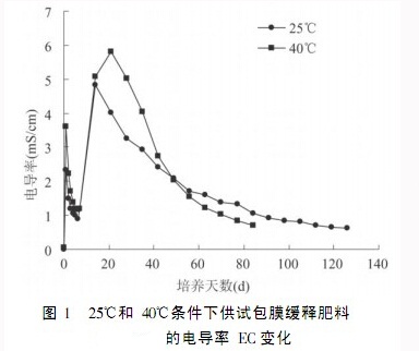25℃和40℃下包膜緩釋肥料靜水培養(yǎng)液的電導(dǎo)率變化見(jiàn)圖1。結(jié)果表明,在兩種溫度下,供試包膜緩釋肥料電導(dǎo)率變化規(guī)律基本一致。二者初始電導(dǎo)率都很高,接著很快下降。這是包膜不完整的肥料顆粒很快釋放造成的。然后在兩種溫度下電導(dǎo)率均快速上升達(dá)到一個(gè)峰值后,逐漸下降。這是由于包膜肥料顆粒逐漸吸水膨脹,滲透壓急劇增高,養(yǎng)分快速溶出形成電導(dǎo)峰值,之后隨著滲透壓逐漸減小,溶出逐漸減少,電導(dǎo)率也隨之逐漸減小。因此,電導(dǎo)率的變化可以反映肥料顆粒包膜是否完整和包膜的緩釋特性,也就是說(shuō)利用電導(dǎo)率值的大小變化可以描述緩釋肥料養(yǎng)分釋放性能。