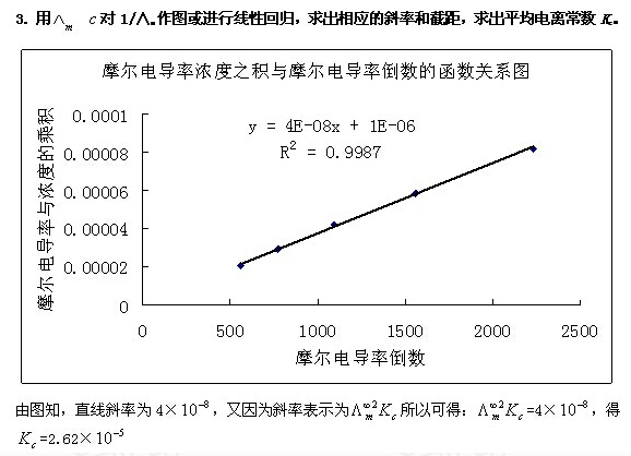 由上式可知,測定系列濃度下溶液的摩爾電導(dǎo)率∧m,將∧mc對1/Λm作圖可得一條直線,由直線斜率可測出在一定濃度范圍內(nèi)Kc的平均值。