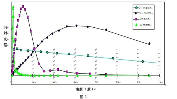 然后再通過該位置的檢測(cè)器所接收到的衍射光的強(qiáng)度,得到所對(duì)應(yīng)粒徑顆粒的百分比含量。但是,顆粒衍射光的強(qiáng)度對(duì)角度的依賴性是隨著顆粒粒徑的變小而降低,如圖 3 所示。當(dāng)顆粒小到幾百納米時(shí),其衍射光強(qiáng)對(duì)于角度幾乎完全失去依賴性,即此時(shí)的衍射光會(huì)分布在很寬的角度范圍內(nèi),而且單位面積上的光強(qiáng)很弱,這無疑增加了檢測(cè)的難度。