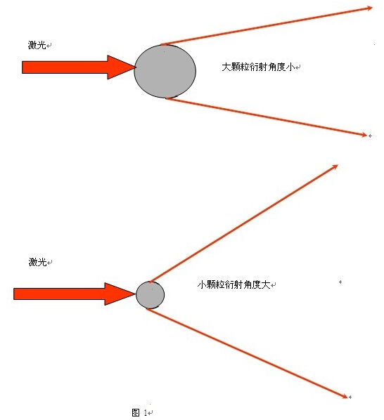 激光粒度儀是基于光衍射現(xiàn)象而設(shè)計(jì)的,當(dāng)顆粒通過激光光束時(shí),顆粒表面會(huì)衍射光,而衍射光的角度與顆粒的粒徑成反向的變化關(guān)系,即大顆粒衍射光的角度小,小顆粒衍射光的角度大,如圖 1 所示。