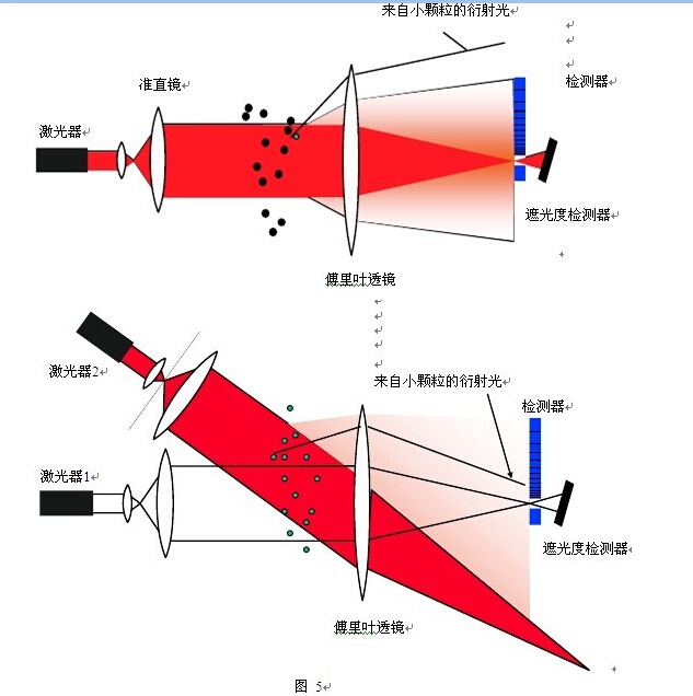 多光源技術(shù)也是采用傅里葉光路配置即樣品池在聚焦透鏡的前方,一般只有分布于幾十度角度范圍的檢測(cè)器,為了增大相對(duì)的檢測(cè)角度,使該檢測(cè)器能夠接收到小顆粒的衍射光信號(hào),在相對(duì)于第一光源光軸的不同角度上再配置第一或第二激光器,如圖 5 所示。這種技術(shù)的優(yōu)點(diǎn)是只需分布于幾十度角度范圍的檢測(cè)器,成本較低,測(cè)量范圍特別是上限可以比較寬,缺點(diǎn)是分布于小角度范圍的小面積檢測(cè)器同時(shí)也被用于小顆粒測(cè)量,由于小顆粒的衍射光在單位面積上的信號(hào)弱,導(dǎo)致小顆粒檢測(cè)時(shí)的信噪比降低,這就是為什么多光源系統(tǒng)在測(cè)量范圍上限超過 1500 微米左右時(shí),若要同時(shí)保證幾微米以下小顆粒的準(zhǔn)確測(cè)量,需要更換短焦距的聚焦透鏡。另外,多透鏡系統(tǒng)在測(cè)量樣品時(shí),不同的激光器是依次開啟,而在干法測(cè)量時(shí),由于顆粒只能一次性通過樣品池,只有一個(gè)光源能被用于測(cè)量,所以一般采用多透鏡技術(shù)的干法測(cè)量的粒徑下限很難低于 250 納米。