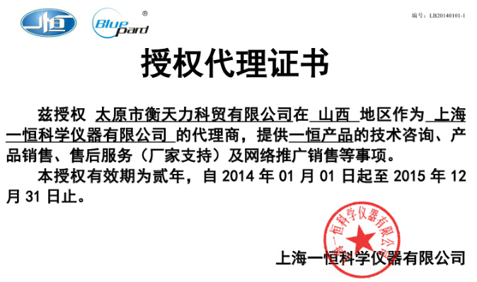 太原衡天力科貿(mào)有限公司是上海一恒授權(quán)的分銷商,授權(quán)經(jīng)銷證書如下: