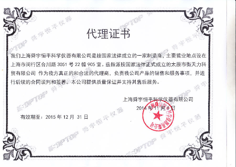 上海恒平科學儀器有限公司有自己的售后部。除此外恒平在很多地方有授權(quán)。太原衡天力是恒平在山西的代理商,銷售恒平所有產(chǎn)品,有售后維修服務(wù)。授權(quán)書如下: