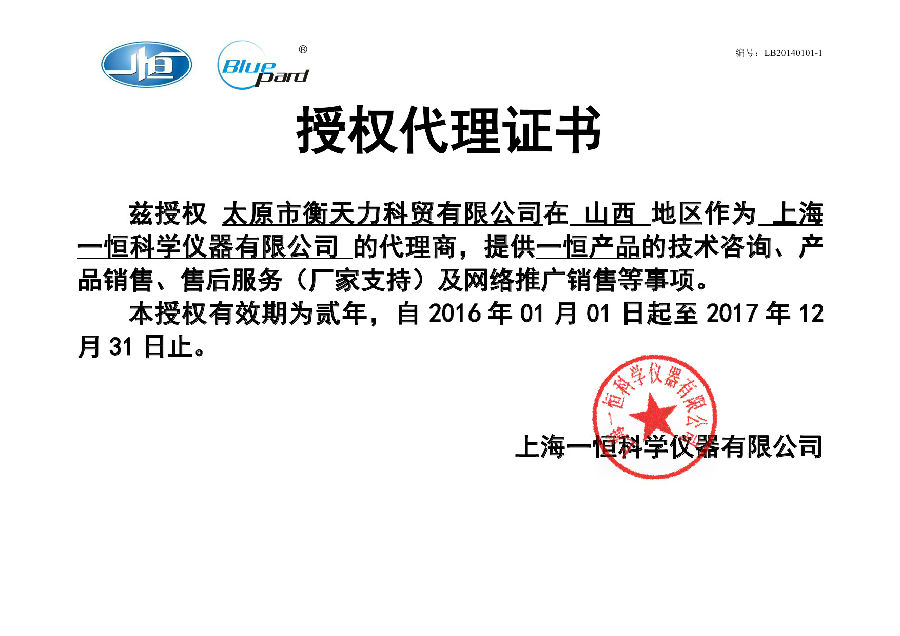 上海一恒已在多地有授權(quán)代理商,太原衡天力科貿(mào)公司是一恒在山西的代理商,銷售和維修一恒所有溫濕度箱體。授權(quán)書如下;